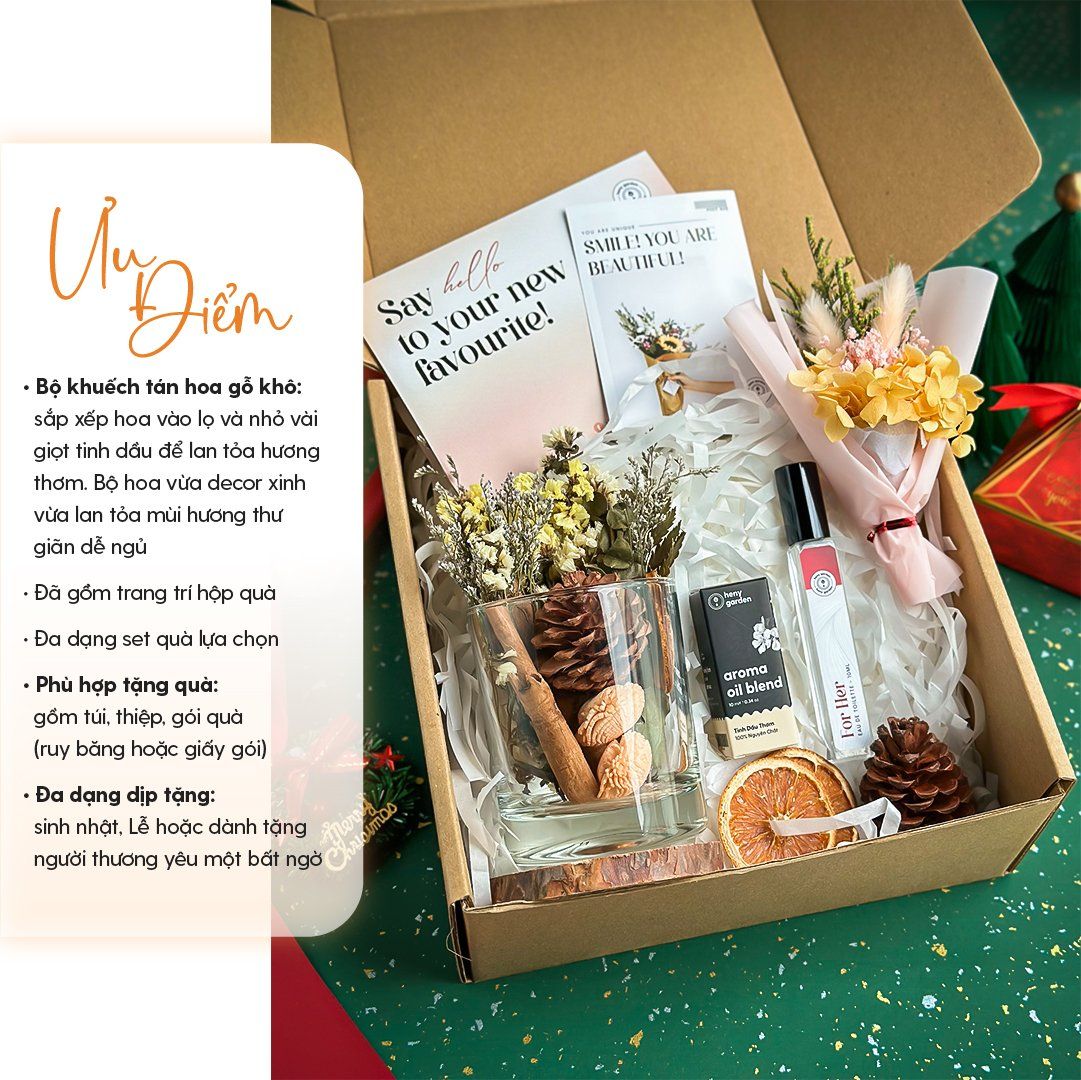 Một chai tinh dầu vừa có thể dùng để nhỏ vào lọ khuếch tán vừa có thể nhỏ vào hoa khuếch tán. Đây sẽ là một set quà không những giúp không gian quanh bạn được ướp đầy hương thơm mà còn có tác dụng như một món đồ decor giúp không gian sinh động hơn. Cách sử dụng bộ hoa khô khuếch tán khá đơn giản, bạn chỉ cần sắp xếp hoa vào cốc rồi nhỏ tinh dầu đi kèm vào để tỏa hương nhé.
